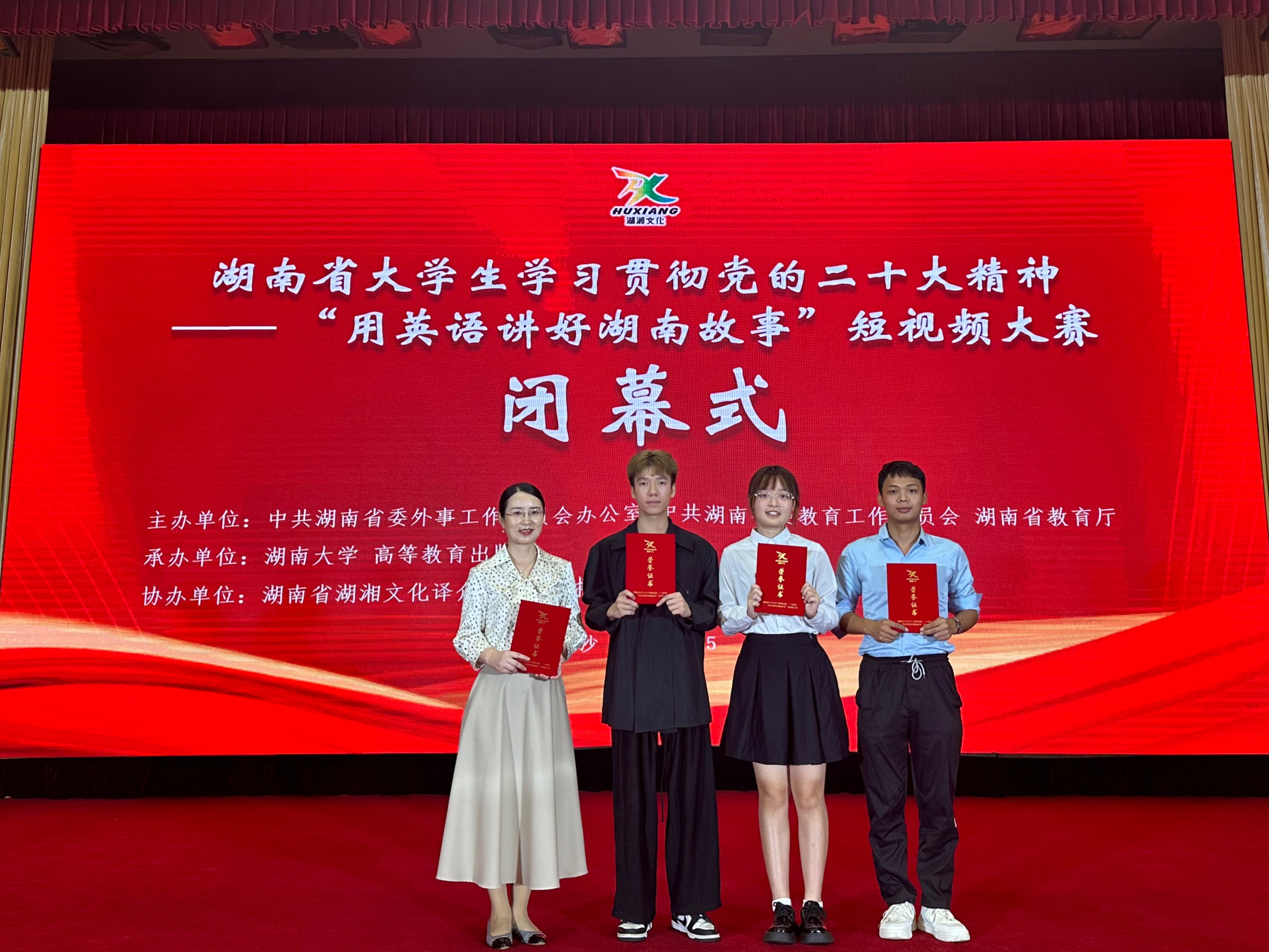 (通讯员 陈凯鹏 宋外飞)9月15日上午,由中共湖南省委外事工作委员会办公室、中共湖南省委教育工作委员会、湖南省教育厅主办,湖南大学、高等教育出版社承办的湖南省大学生学习贯彻党的二十大精神——“用英语讲好湖南故事”短视频大赛闭幕式暨颁奖典礼于长沙市举行。中共湖南省委外办副主任邱爱华、高等教育出版社总编辑谭方正致辞,湖南省教育厅一级巡视员罗桂香宣布获奖名单。本次大赛分本科组和高职高专组,全省高校踊跃参赛,最终全省116所高校共提交297件参赛作品,其中普通本科173件,高职高专124件。经过评审专家组的认真评审,本科组一等奖14件、二等奖21件、三等奖35件;高职高专组一等奖10件、二等奖15件、三等奖25件,12所高校荣获优秀组织奖。吉首大学选送的四件参赛作品全部获奖。 石琳副院长率一二等奖团队代表参加了此次颁奖典礼。