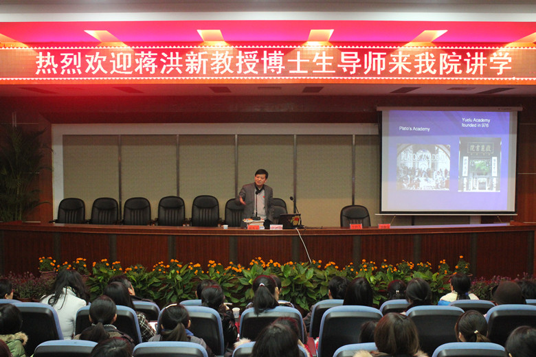 在《浅谈大学人文教育》的学术报告中,蒋洪新教授指出,大学是充满人文关怀、人文底蕴的地方,人文教育真正体现大学内涵,也是大学的意义所在。蒋洪新教授认为,大学人文教育主要指的是大学本科阶段的通识教育,其培养人才的宗旨是先人后才。具体而言,就是调动人文学科的各种资源,培养人的综合素质,通过文史哲的相互浸渗融会贯通,让学生形成宽阔而又深邃的视野,充满理性智慧而又不失人伦情感的生命立场,清醒地了解自我责任而又能推己及人的生命关怀。他简要回顾了中外大学人文教育的发展历程,并以芝加哥大学、美国加州大学洛杉矶分校等大学为例,介绍了美国的通识教育。同时,他也在深入剖析当前我国大学通识教育在课程设置等方面存在的问题的基础上,提出了自己的设想和建议。