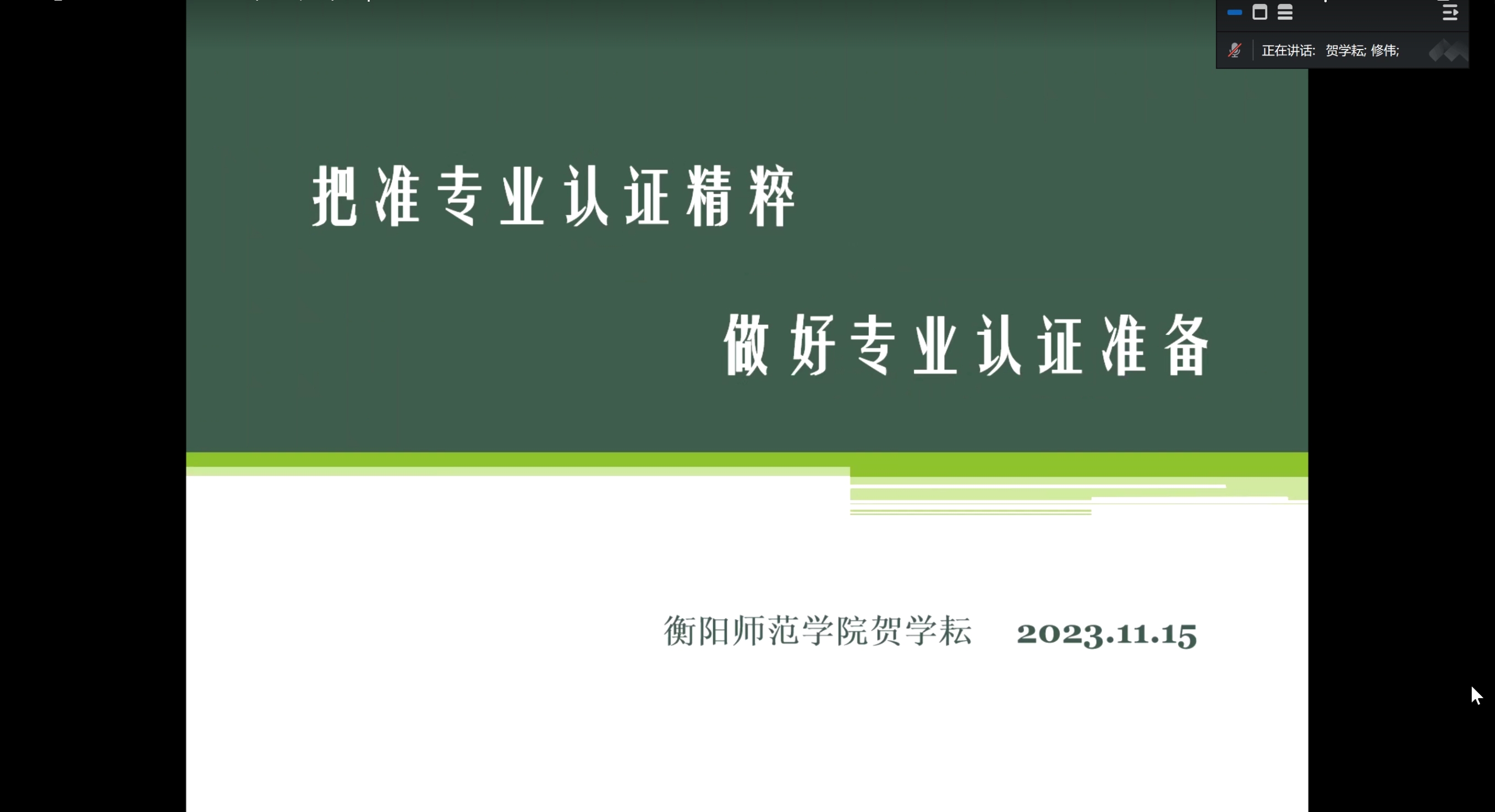 贺学耘教授的主讲题目是《把准专业认证精粹 做好专业认证准备》,她从专业认证的基本原理解读开始,介绍了师范类专业认证的核心理念,回顾了衡阳师范学院 专业认证准备和措施,讲解了如何设定课程目标,并以案例形式分享了该校如何在课程教学中体现专业认证的学生中心、产出导向、持续改进理念。