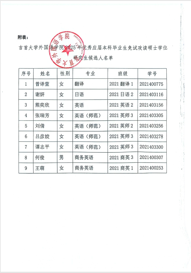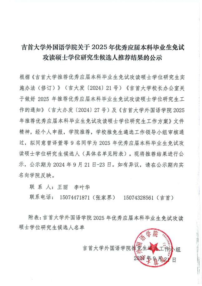 关于2025年优秀应届本科毕业生免试攻读硕士学位研究生候选人推荐结果公示