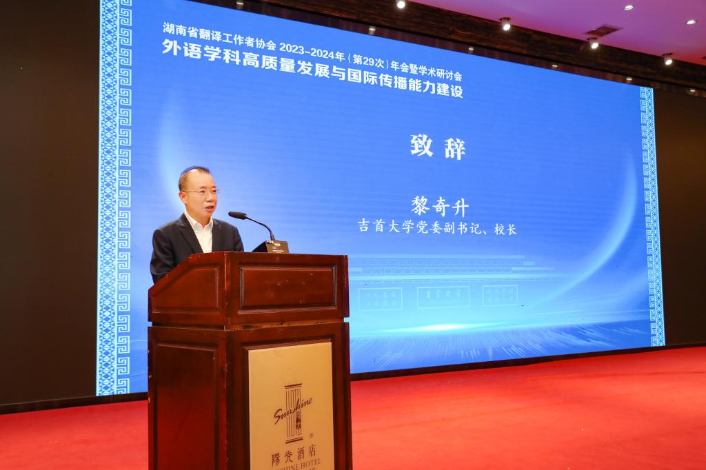 开幕式上,校长黎奇升教授致辞,他对湖南省译协和兄弟单位莅临吉首大学表示热烈欢迎,对省译协和兄弟单位长期以来对我校外语学科建设发展的支持表示感谢。他表示我校高度重视包括翻译学在内的外语学科建设,将翻译学科建设列入学校国际化发展战略,翻译学科在服务学校发展战略,与优势学科互动双赢方面具有广阔前景。开幕式由我校党委委员、副校长姜又春教授主持。