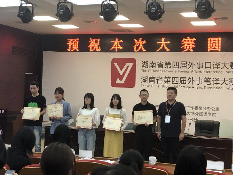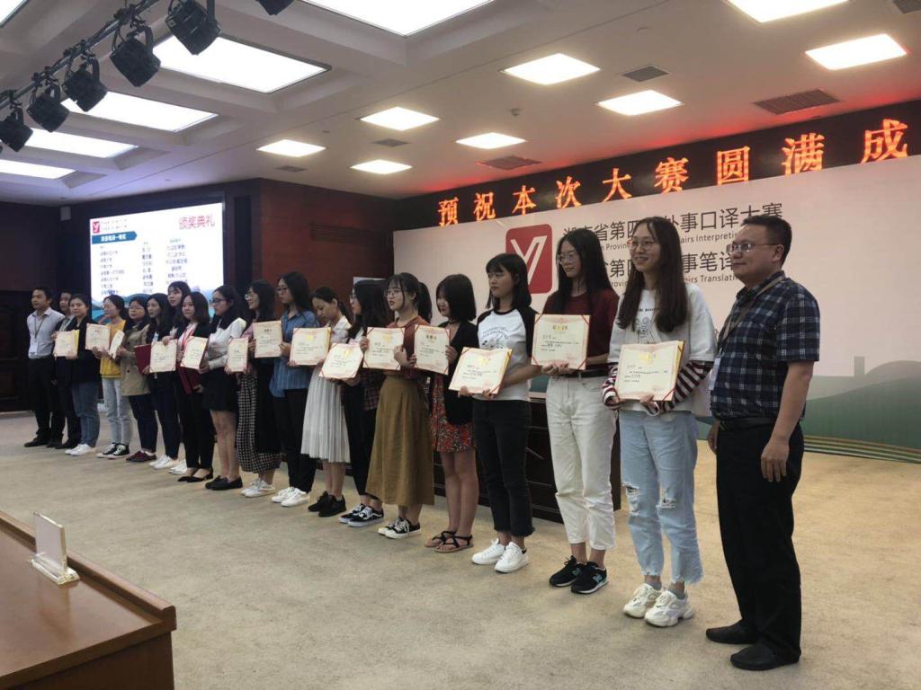 本网讯(通讯员 吴雅格 龙佳佳 潘贵民)5月11日,由中共湖南省委外事工作委员会办公室主办的湖南省第四届外事翻译大赛在中南林业科技大学举行, 学子在滕建姣、潘贵民老师的精心指导下与省内985高校、211高校和湖南省各大外事机构的从业人员同台竞技、表现优异,12名选手获奖,其中获特等奖1项、一等奖5项、二等奖5项、三等奖1项,实现了获奖人数和获奖等级的新高。