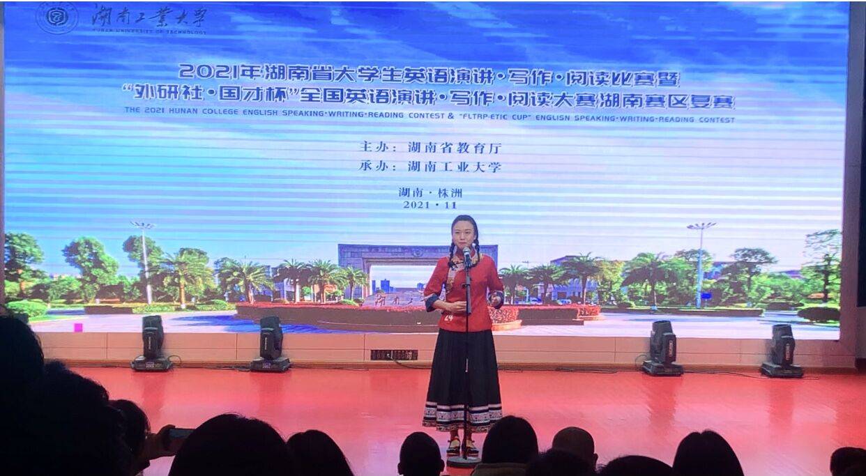 本网讯(修伟)11月26—28日,2021年湖南省大学生英语演讲、写作、阅读比赛暨“外研社﹡国才杯”全国英语演讲、写作、阅读大赛湖南赛区复赛在湖南工业大学举行。我校学子荣获一等奖3项,二等奖2项,三等奖2项,我校代表队获团体二等奖,一举揽获比赛各类奖项,为学校赢得了荣誉。