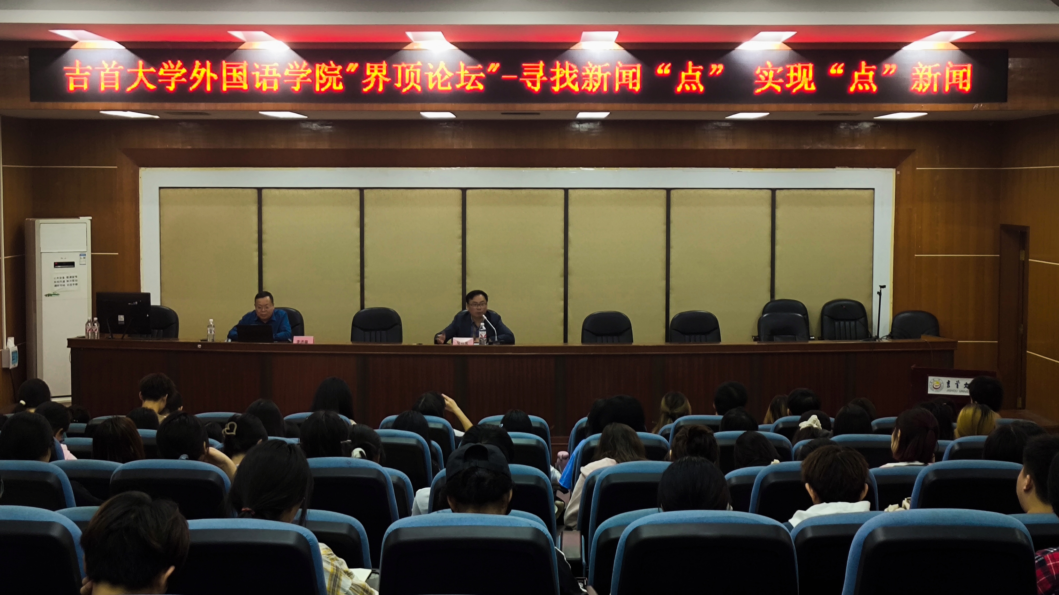 本网讯(修伟 陈慧 李安妮 赵艺)10月9日晚19:00应 党委邀请,校党委宣传部常务副部长李洪雄研究员做客“界顶论坛”在张家界校区逸夫教学楼多功能报告厅为校区师生作题为《寻找新闻“点” 实现“点”新闻》新闻写作报告,报告由 党委书记简功友主持,张家界校区 师生及校区新闻写作爱好者100余人出席。
