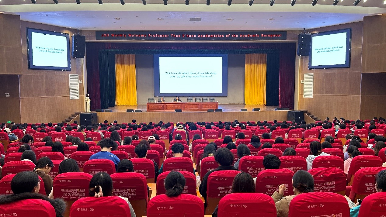 本网讯(通讯员 季恩琼)2023年11月23日晚,欧洲科学院院士、国际比较文学协会提名委员会主席(2013-2016)、《欧洲评论》主编特奥·德汉(Theodoor Louis D’ haen)教授做客 “界顶论坛”, 在吉首大学张家界校区大礼堂做了题为“世界文学、时代变迁、多样世界/ World Literature, World Times, Worlds”的学术讲座。讲座由 党委书记简功友博士主持,在校师生共700余人聆听了讲座并与德汉教授互动交流。