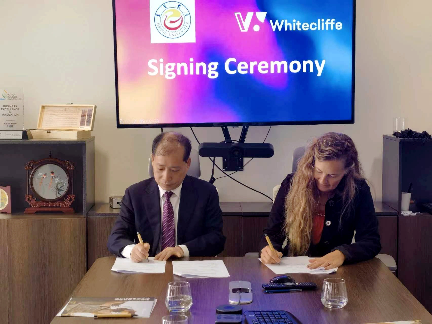4月19日上午,廖志坤一行访问了新西兰怀特克利夫艺术与设计学院。与该校校长菲·艾莫洛尔、艺术学院院长玛特、国际部梅·迟等进行座谈。菲·艾莫洛尔校长介绍了怀特克利夫艺术与设计学院的办学历史、专业布局与学校影响力等基本情况,对两校建立学术合作伙伴关系、开展交流合作表示欢迎。双方就师生互派、寒暑假短期学习、入学前英语培训等议题进行了讨论,并签署学术合作伙伴关系备忘录。下午,廖志坤一行考察了该校艺术学院、服装设计学院、珠宝设计学院、数字媒体学院,并就艺术学院美术专业课程设置与实践情况与玛特进行了深入讨论。