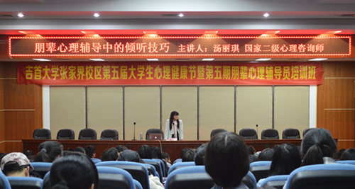 本网讯(杨东旭 余孟韬 蒋超男) 2015年3月29日早8点吉首大学张家界校区第五届大学生心理健康节暨第五期朋辈心理辅导员培训讲座于逸夫楼多功能报告厅举行,由学生罗静、吴亚鹏主持本次讲座,心理咨询师傅芳、张洁、汤丽琪、曹雅婷等四位分别对“朋辈关系”的各个方面进行了专项讲解。