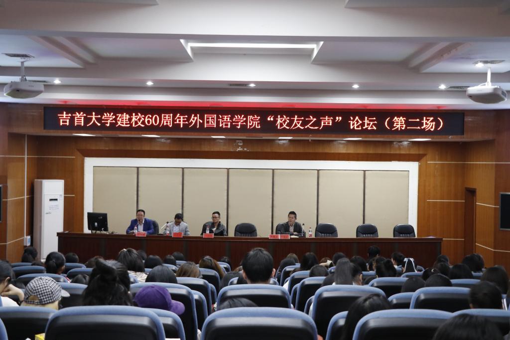 本网讯(通讯员 龙锐 张丽娜 唐明俊 覃思思 曹辰亮 吴越)10月12日下午, 于逸夫楼多功能报告厅举行吉首大学建校60周年“校友之声”论坛,学院特邀王隆国、陈学亮和许英俊三位校友主讲本次论坛,论坛由 院长汤敬安主持,300余名师生参与其中。